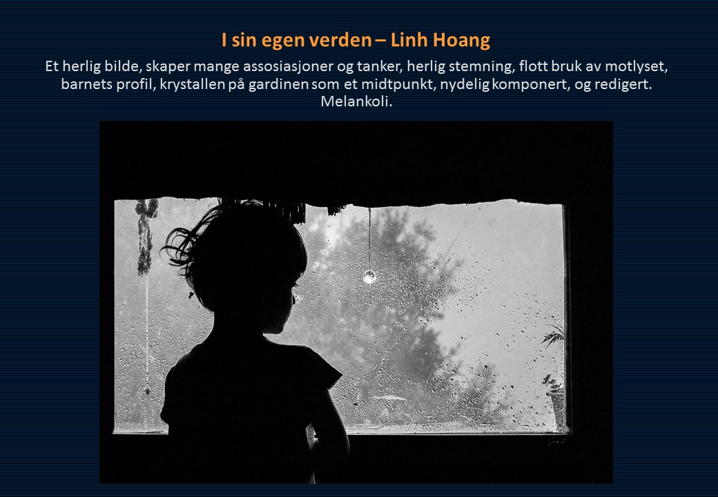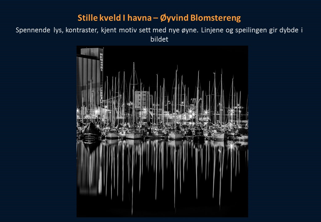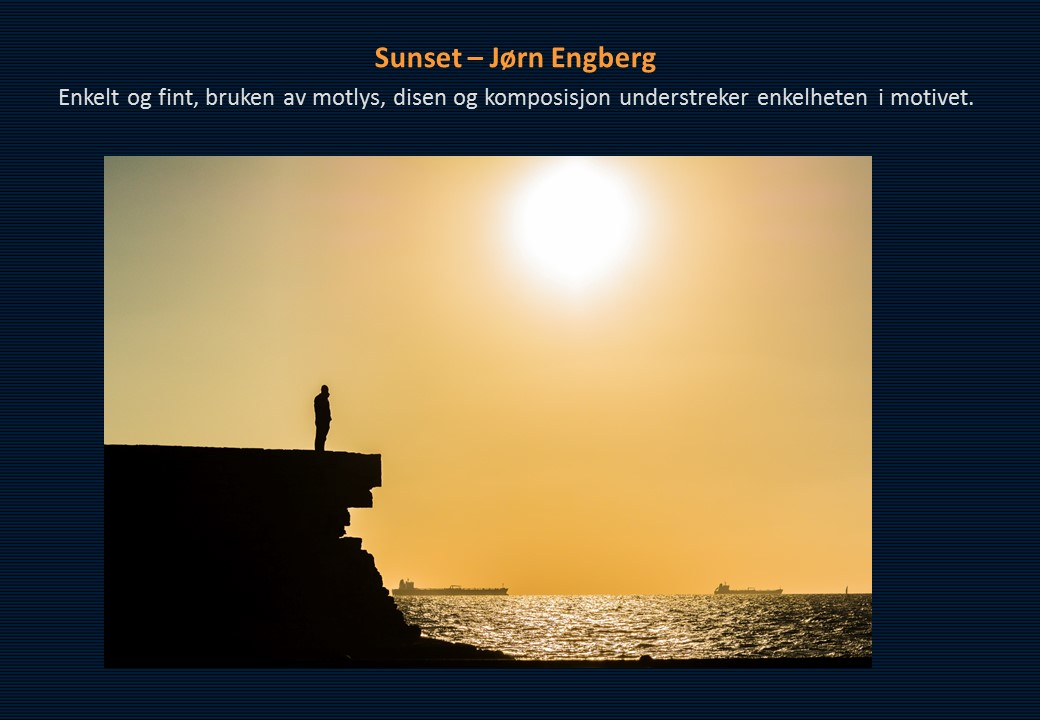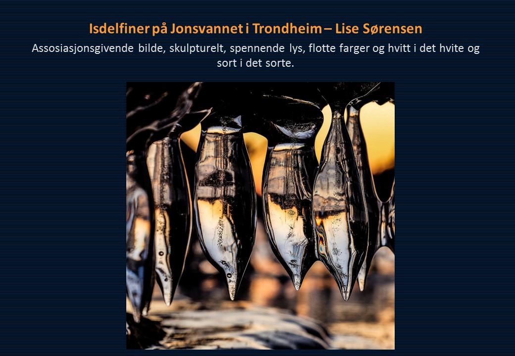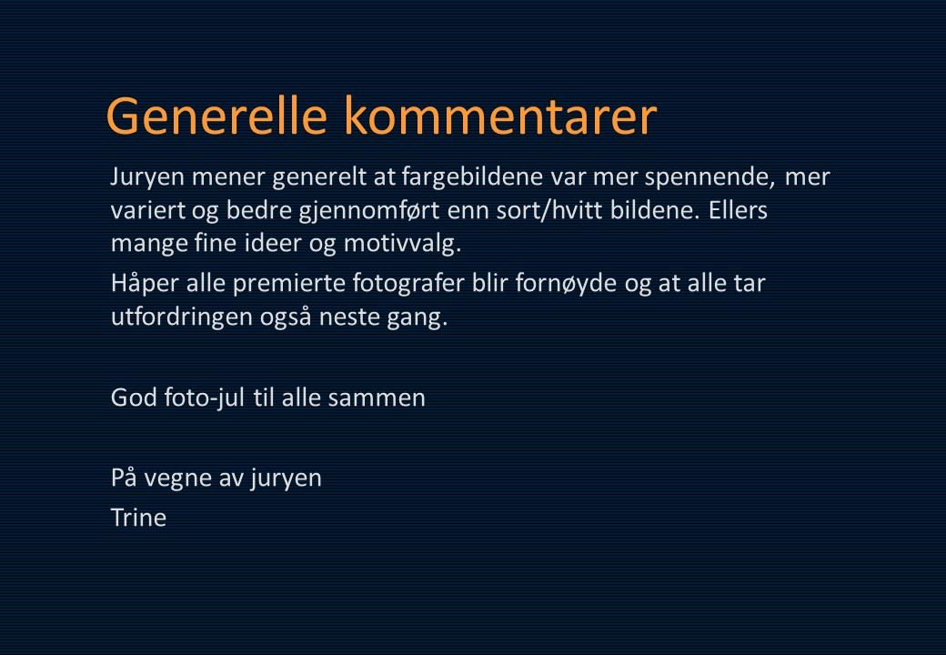 Juryens kommentar: Juryen mener generelt at fargebildene var mer spennende, mer variert og bedre gjennomført enn sort/hvitt bildene. Ellers mange fine ideer og motivvalg.